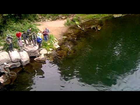 Tomas el de Collanzo, sacando un preciosos salmón desde encima del Puente Quinzanas.